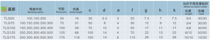 JS.106006 TLG型鋼制拖鏈 TLG型鋼制拖鏈可承載數(shù)量多,重量大的電纜及油管,自由懸置(允許不用支承輪)長(zhǎng)度大,支撐板可依顧客需要制作,適用于工作母機(jī),移動(dòng)機(jī)械等。其彎曲半徑為50-600mm,鏈板高度為35-150mm,可任意使用。 TLG型鋼制拖鏈其使用行程較大為32米。適用于所有傳動(dòng)方式?呻S意加長(zhǎng)和縮短。此外,可通過(guò)改變銷(xiāo)軸獲得改變彎曲半徑。 拖鏈的支撐板寬度為150mm至600mm,孔與孔之間的間隔量為5mm。 鏈板的高度,也就是支撐板的高度,是由電纜較大直徑?jīng)Q定的,機(jī)床較大限度運(yùn)轉(zhuǎn)時(shí),如拖鏈的寬度超過(guò)300mm,拖鏈的長(zhǎng)度超過(guò)4m時(shí)出于穩(wěn)定性原因,應(yīng)考慮選擇加大一號(hào)規(guī)格的拖鏈。 彎曲半徑要根據(jù)電纜的較大直徑選擇并應(yīng)達(dá)到電纜直徑的10倍。彎曲半徑可根據(jù)所給表格選擇50-600mm,行程小的可相應(yīng)選擇較小的半徑。 拖鏈的長(zhǎng)=1/2行程+4個(gè)彎曲半徑,這只適用于當(dāng)固定聯(lián)結(jié)是在行程的中點(diǎn)時(shí)。 拖鏈的固定可根據(jù)機(jī)床的位置情況選擇。固定角鋼可放在外圍或內(nèi)周的拖鏈內(nèi)或外部,一般情況聯(lián)結(jié)部分在拖鏈內(nèi),而向外周。