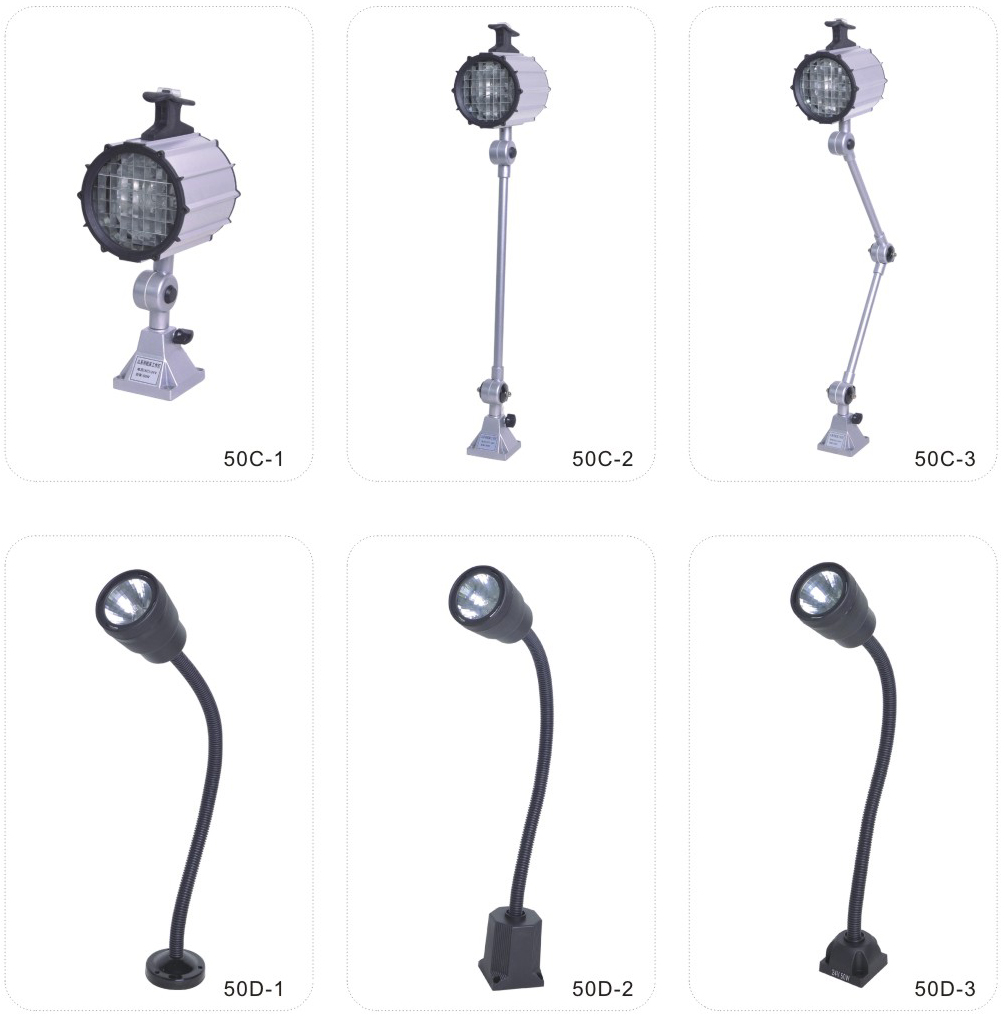 JS.109003 50C、50D系列工作燈 50C工作燈采用新光源鹵鎢燈泡,光線柔和,聚光性好,適用于各種大中型機(jī)床,數(shù)控機(jī)床,加工中心及普通機(jī)床的照明,并具有防水、防爆、防侵蝕等優(yōu)點(diǎn)。 50D適用于中小型機(jī)床,醫(yī)療設(shè)備及汽車(chē)修理、船舶檢修、設(shè)備維修的工作照明。可內(nèi)裝電子變壓器,輸入不同電壓。